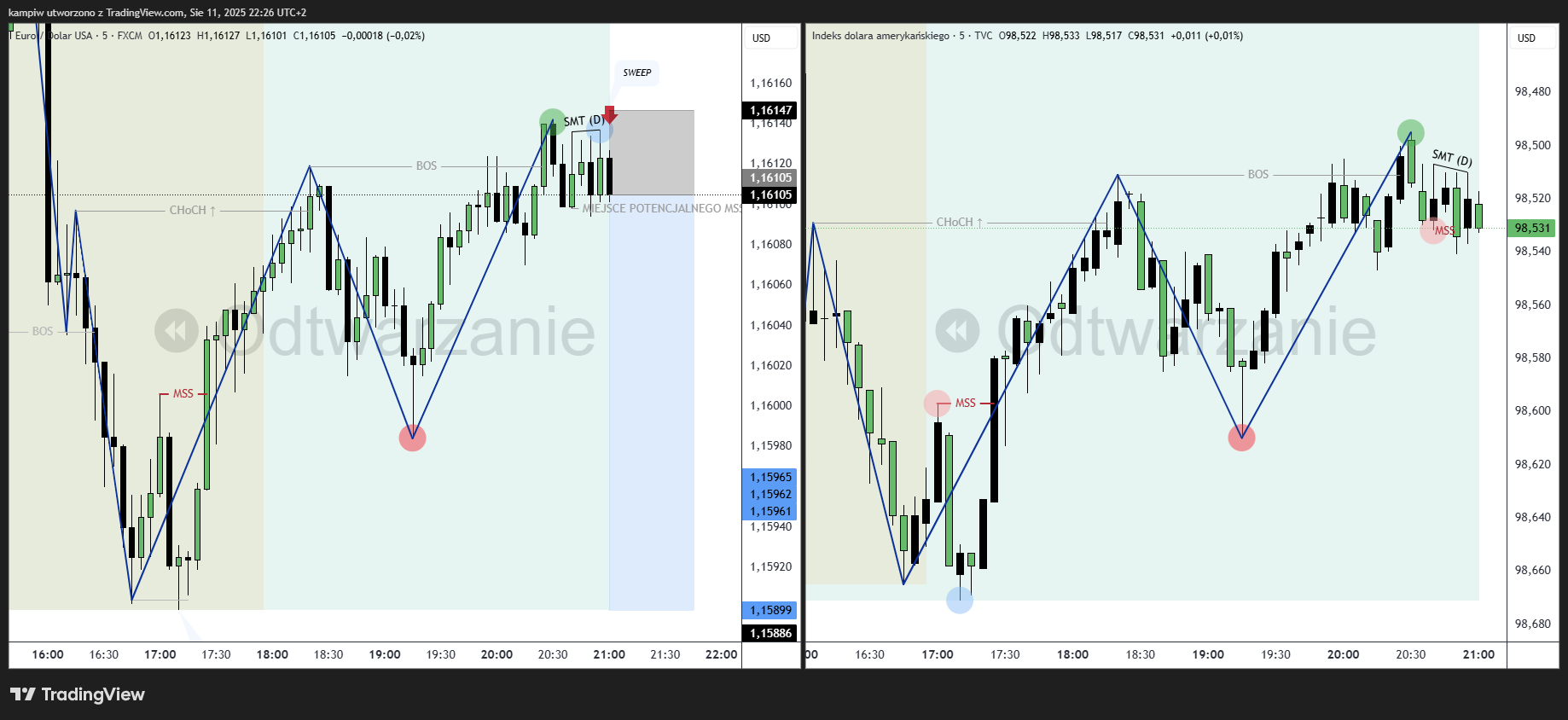 Po uformowaniu się pierwszego dołka po BOS, znajdującego się blisko ostatniego szczytu, pojawiła się dywergencja SMT (D). Na DXY wystąpił już wcześniej MSS, co dodatkowo potwierdzało scenariusz spadkowy.