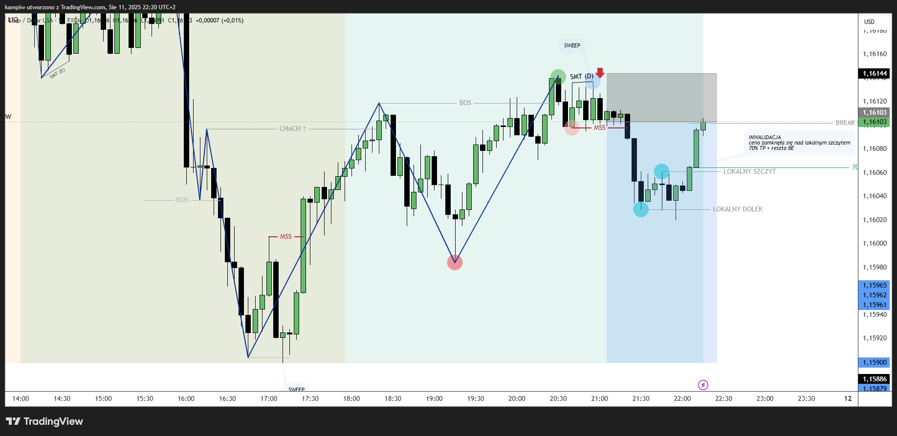 Cena zareagowała zgodnie z kierunkiem short. Po MSS ukształtował się lokalny dołek oraz szczyt, jednak zamknięcie świecy powyżej tego szczytu zanegowało dalszy potencjał spadków.