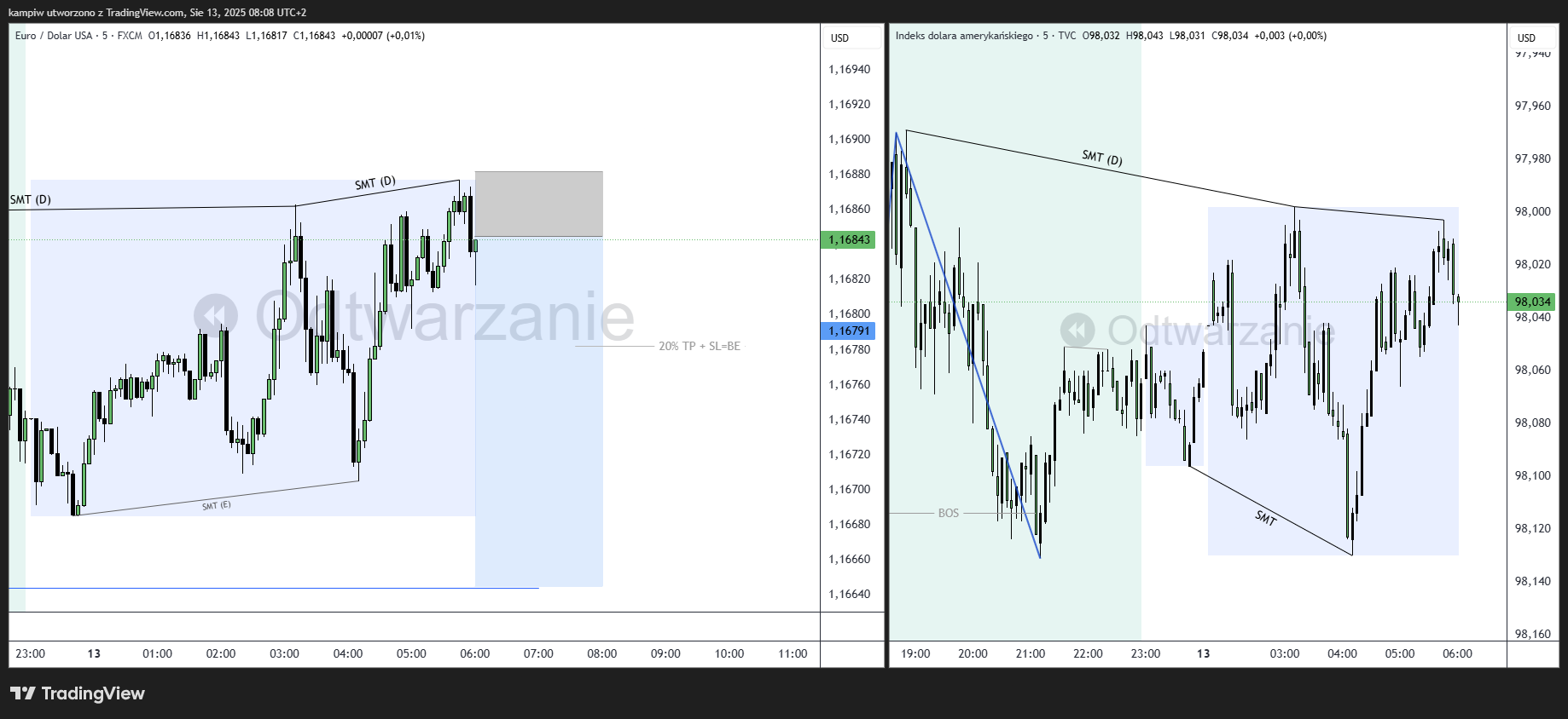 Później: pojawiło się SMT (D) spadkowe, ale bez MSS↓ (brak zamknięcia poniżej ostatniego potwierdzonego HL).