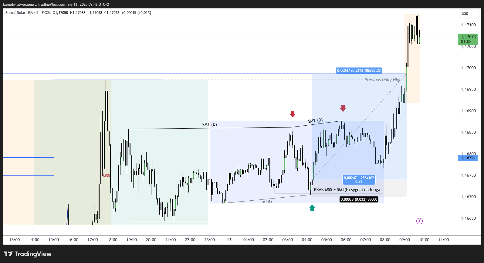 Po zebraniu LTF low: silne SMT (E) wzrostowe → mocny impuls w górę (ustawił bias long).