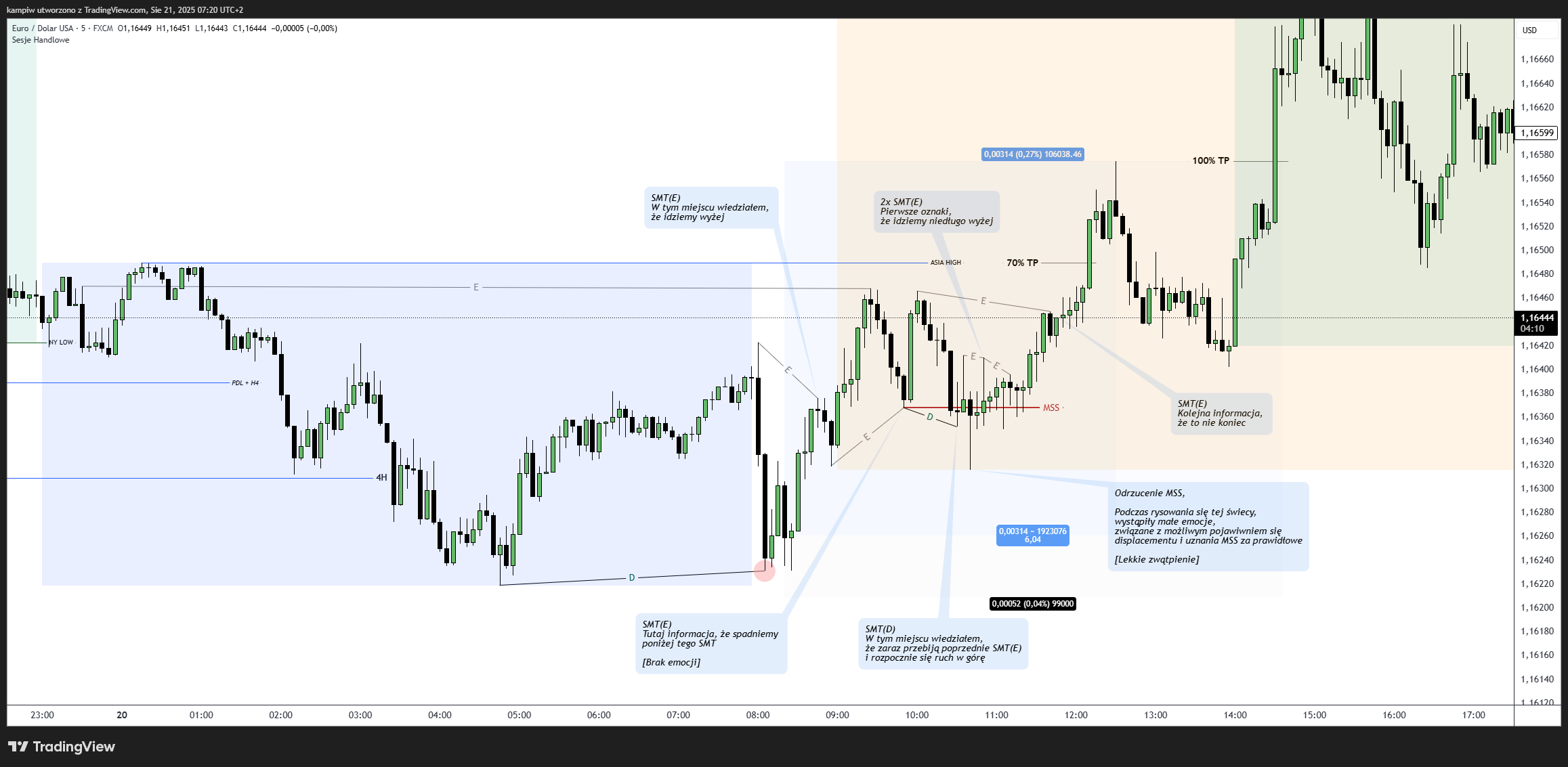TP targetowałem w okolice Azja High, na potencjalny powrót do shortów – nie wystąpiło SMT(D) spadkowe na London Session, oraz na NY Session co pozstawiło bias wzrostowy Azji.